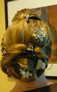 My updo is a combination of side lace braids and a big bun. I added lots of hair clips and two metallic flower clips as accents, plus to help keep my hair in place. Thank you so much for coming to see my pictures!